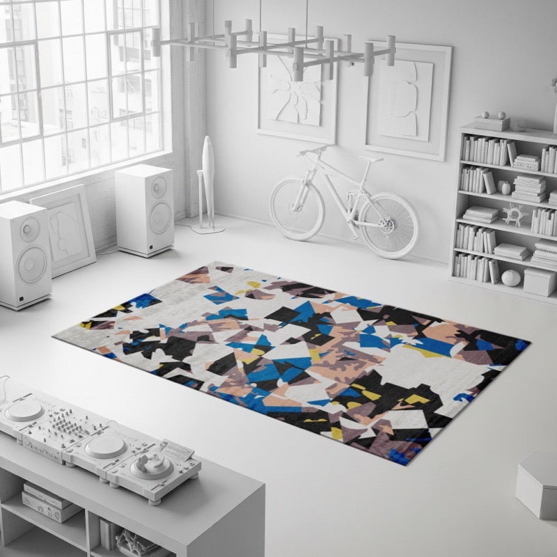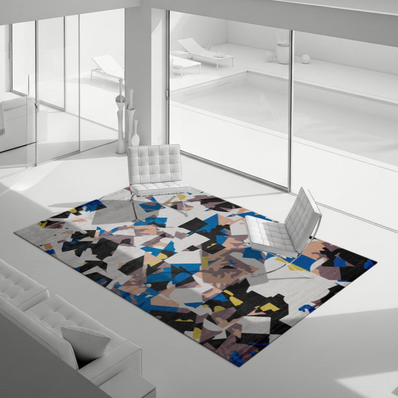 This design is a vivid exploration of geometric abstraction, where a powerful, fractured composition of angular forms in a dynamic palette of blues, yellows, and black creates a sense of aggressive confidence. The rug's unapologetic energy and strong, fragmented design make it a commanding foundation for a space that values authority and modern power.